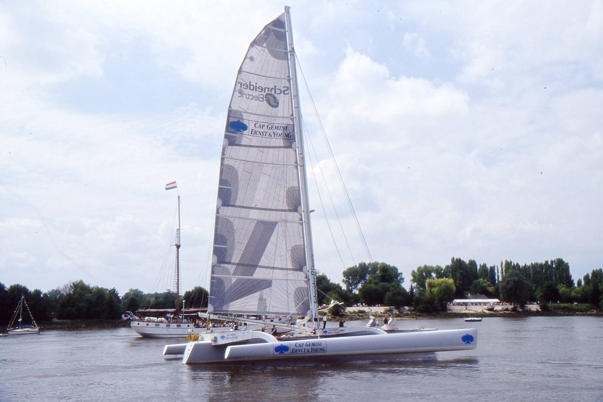 Le maxi-catamaran Geronimo d’Olivier de Kersauson construit au chantier de Vannes, mis à l’eau le 22 juillet 2001.