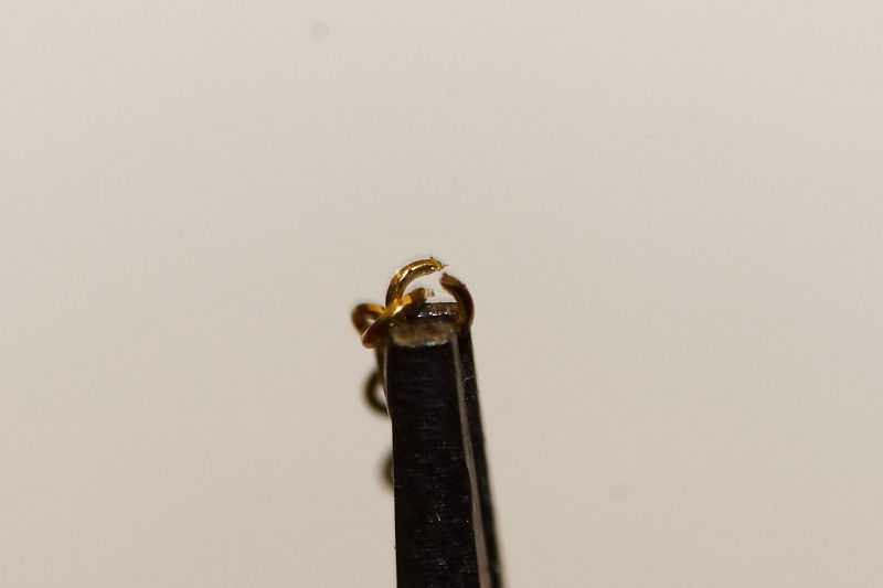 Le ressort en laiton ainsi formé est ôté du fil de 0.8mm en coupant l’extrémité soudée.