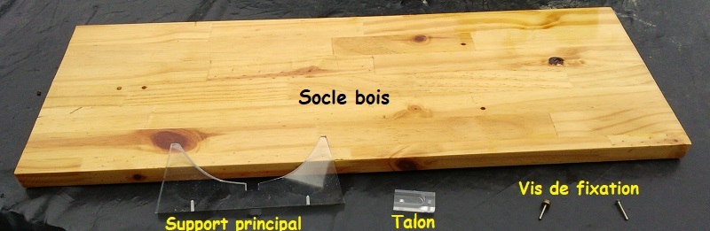 Tout d’abord une belle planche un peu plus grande que la maquette environ 2 à 2.5 cm de plus de chaque côté. Après y avoir percé les trous pour la fixation des supports la vernir ou de la peindre.
