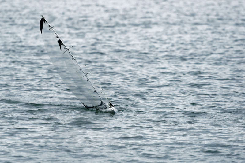 – Le voilier de Francis M. classe RG65 , longueur 65cm, poids 1500g de construction personnelle dans une tempête.