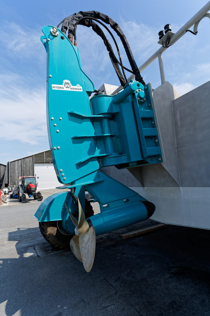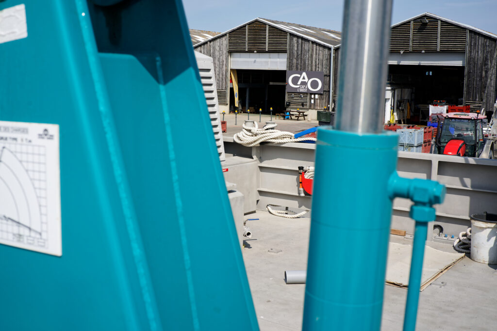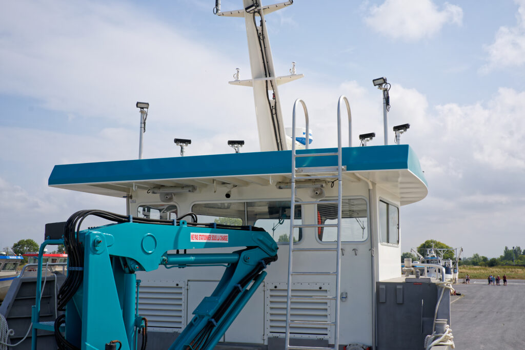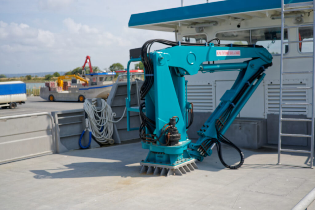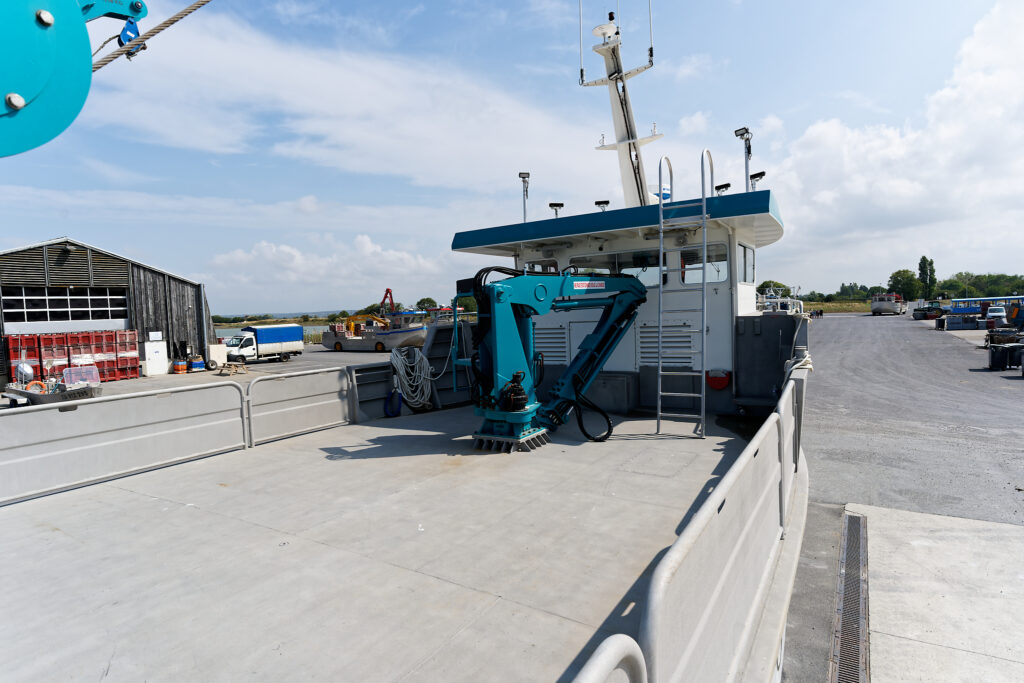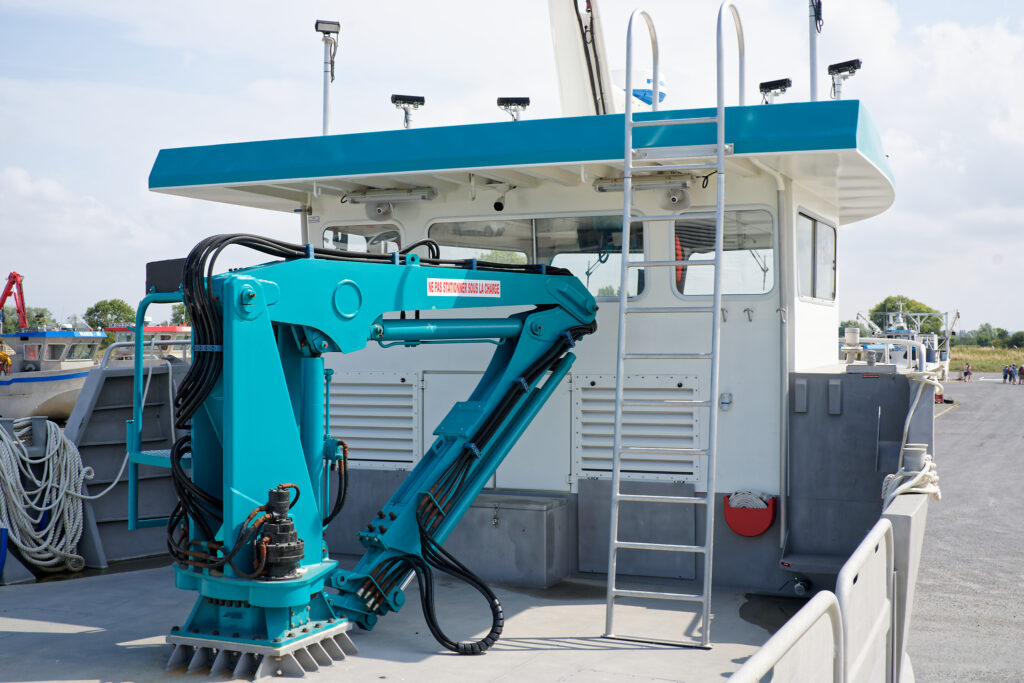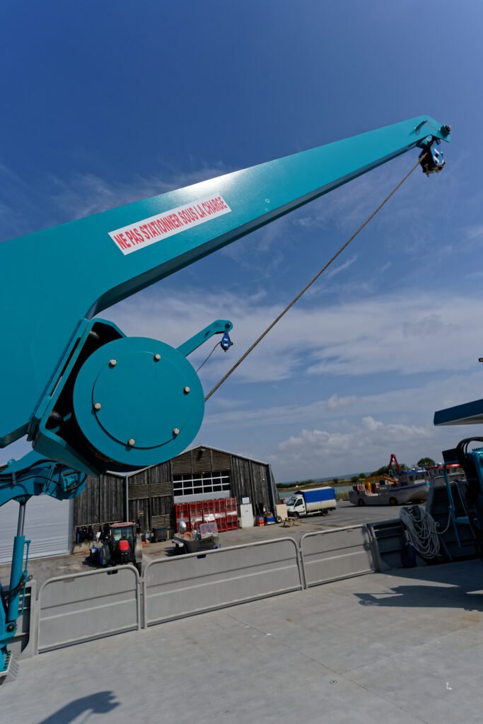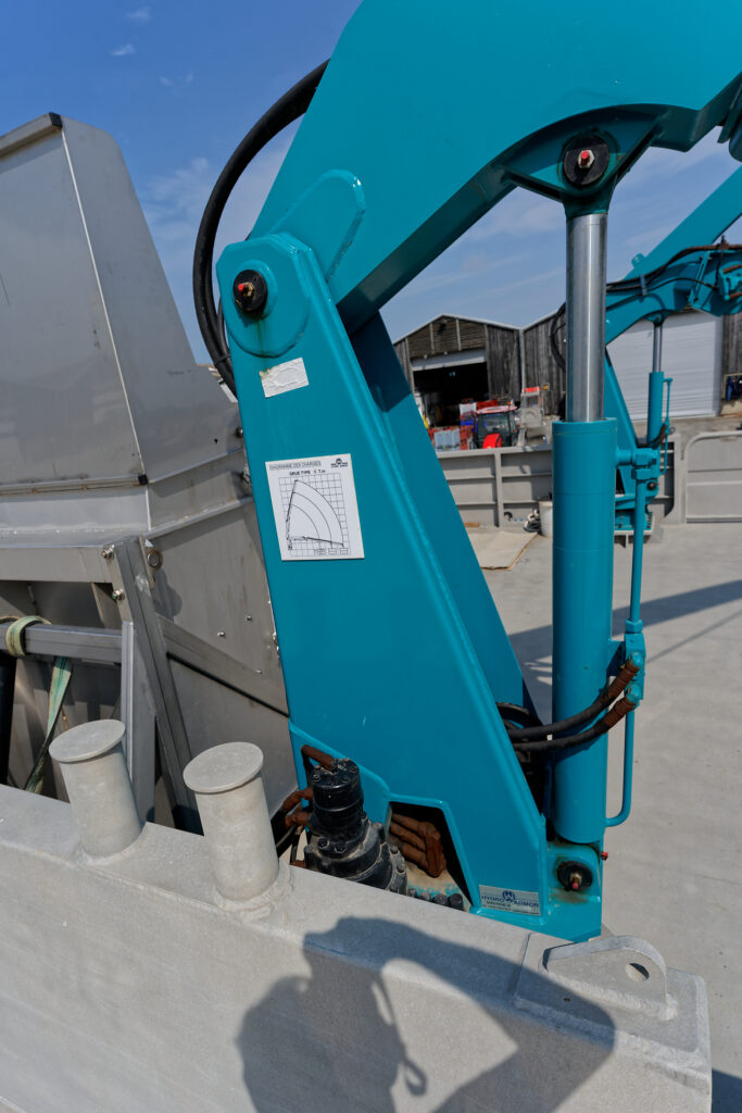 il est équipé d’une grue hydraulique 7 T/M 2T, deux potences hydrauliques 7 T/M et d’un propulseur d’étrave hydraulique.