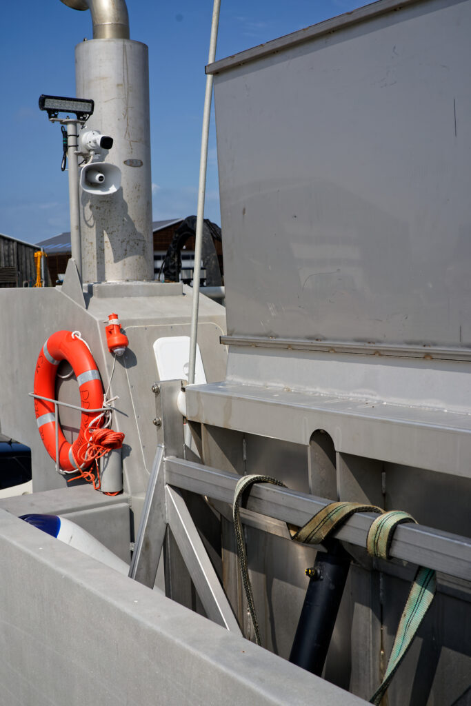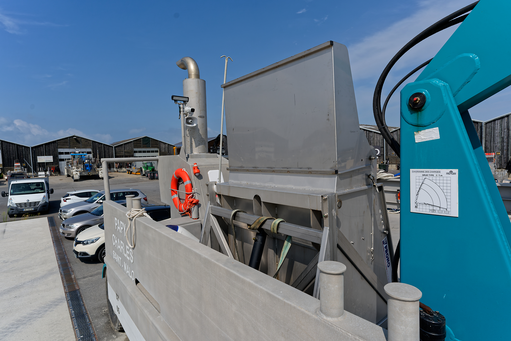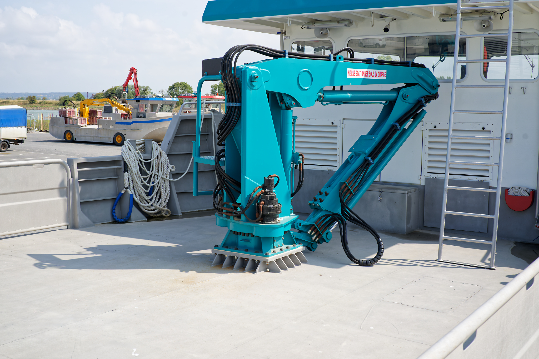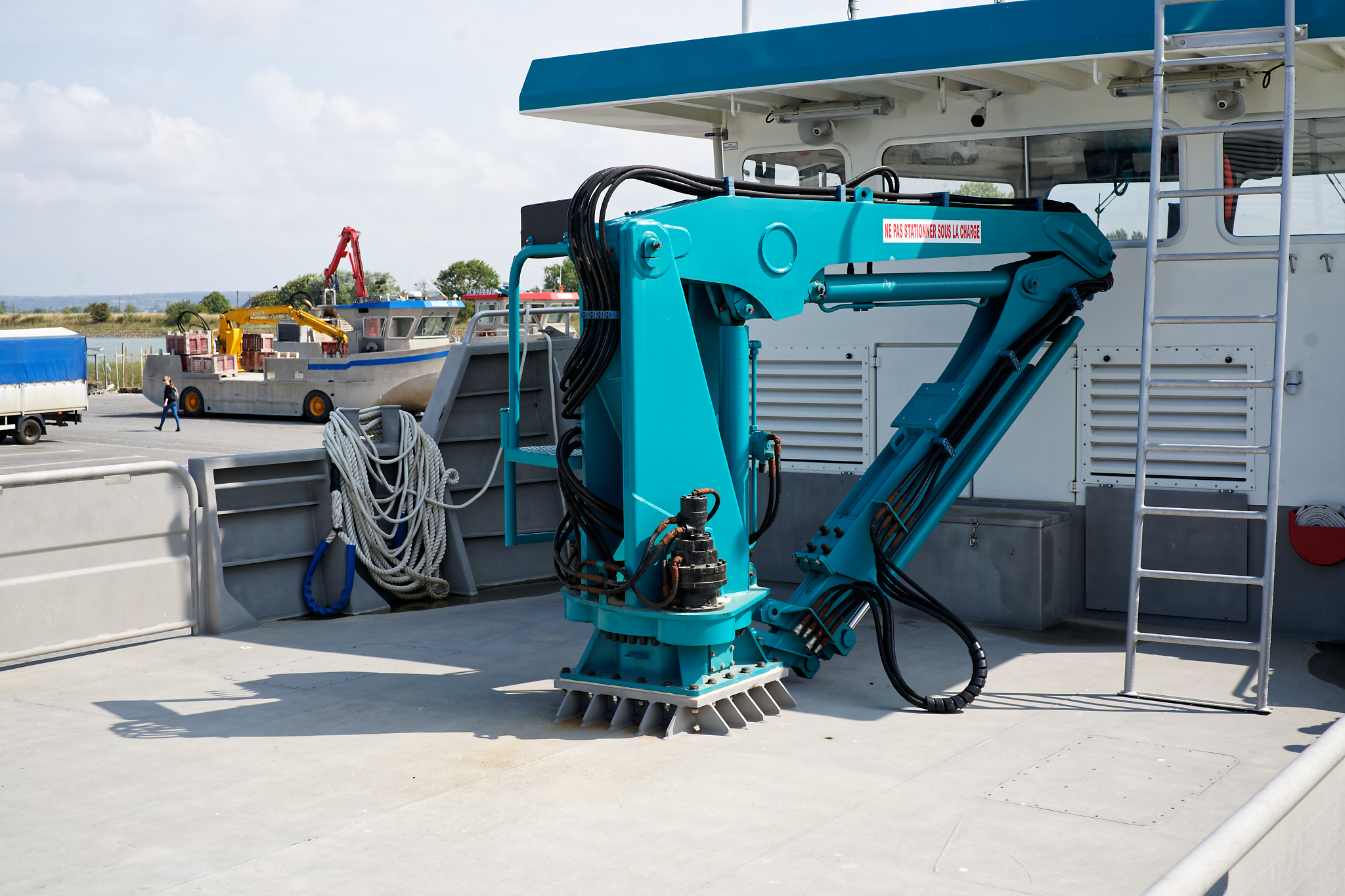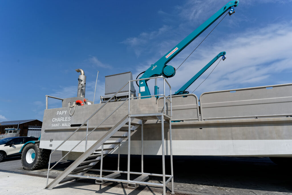 il est équipé d’une grue hydraulique 7 T/M 2T, deux potences hydrauliques 7 T/M et d’un propulseur d’étrave hydraulique.