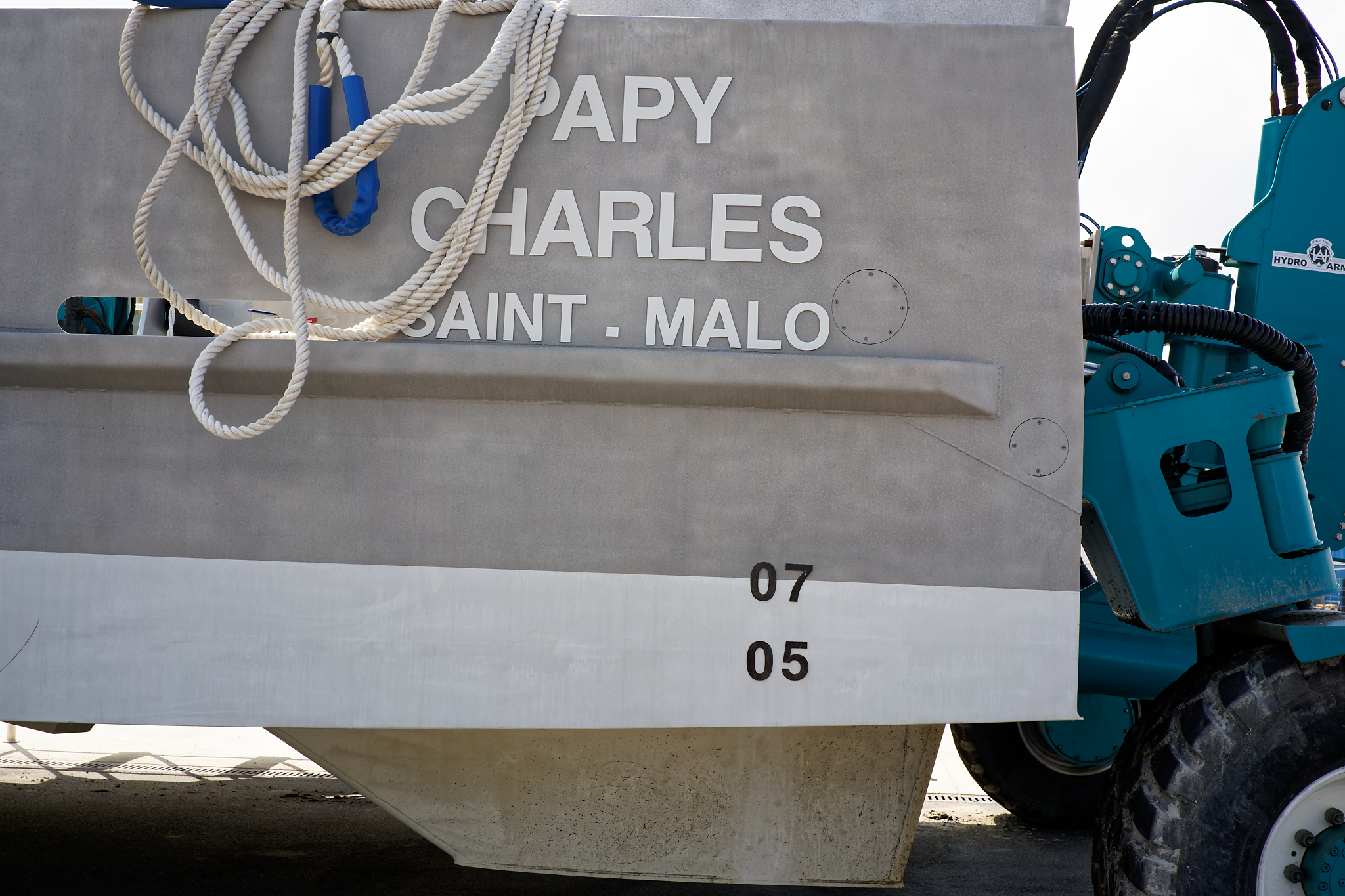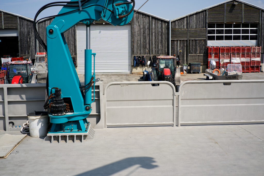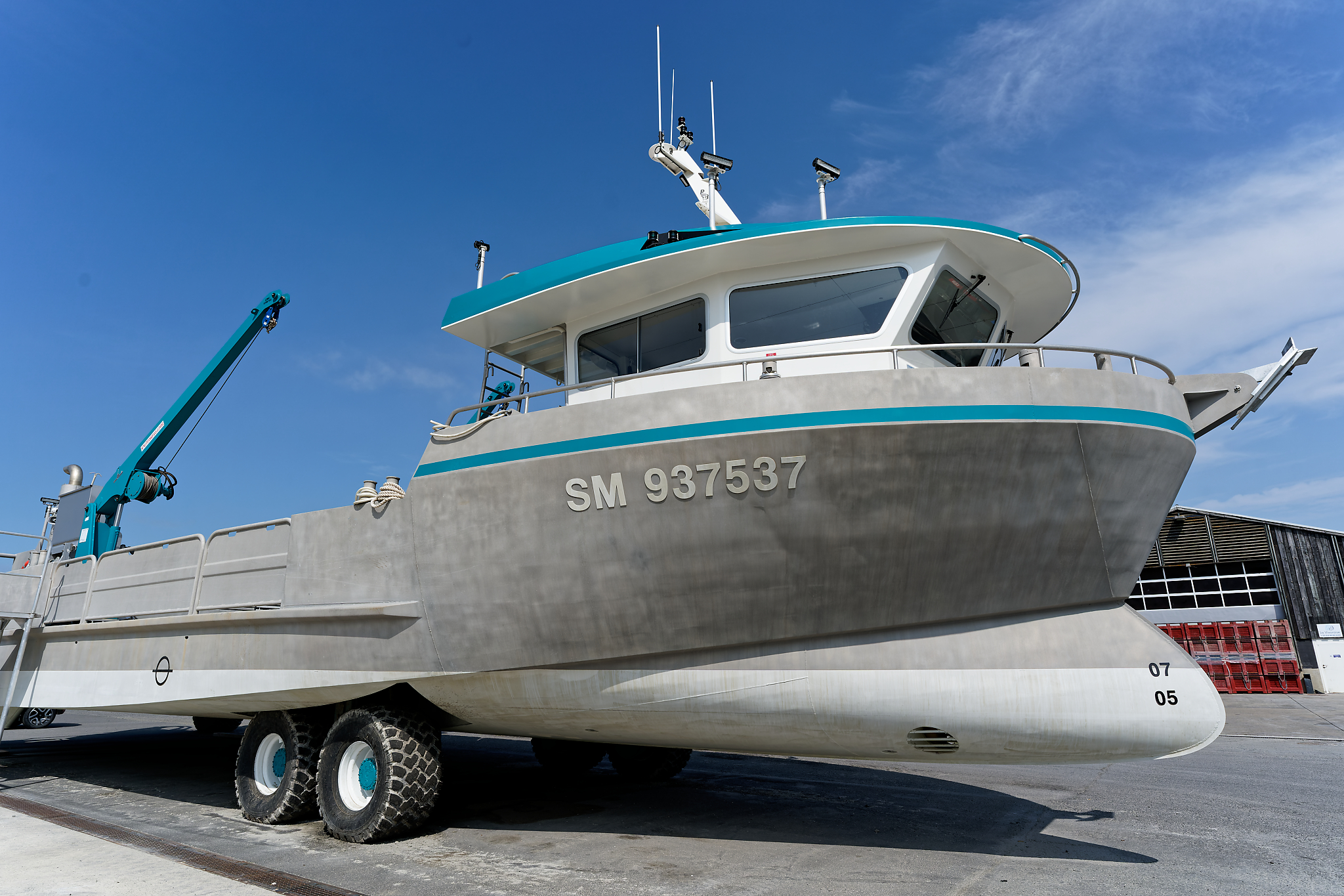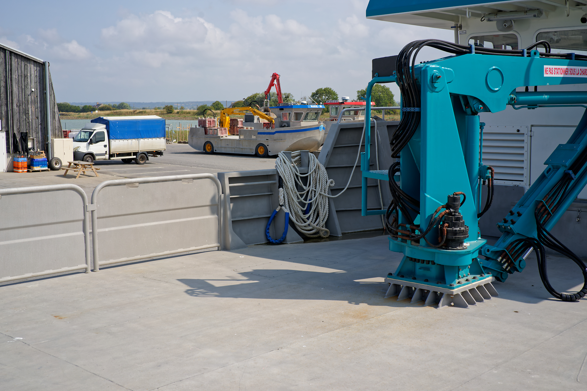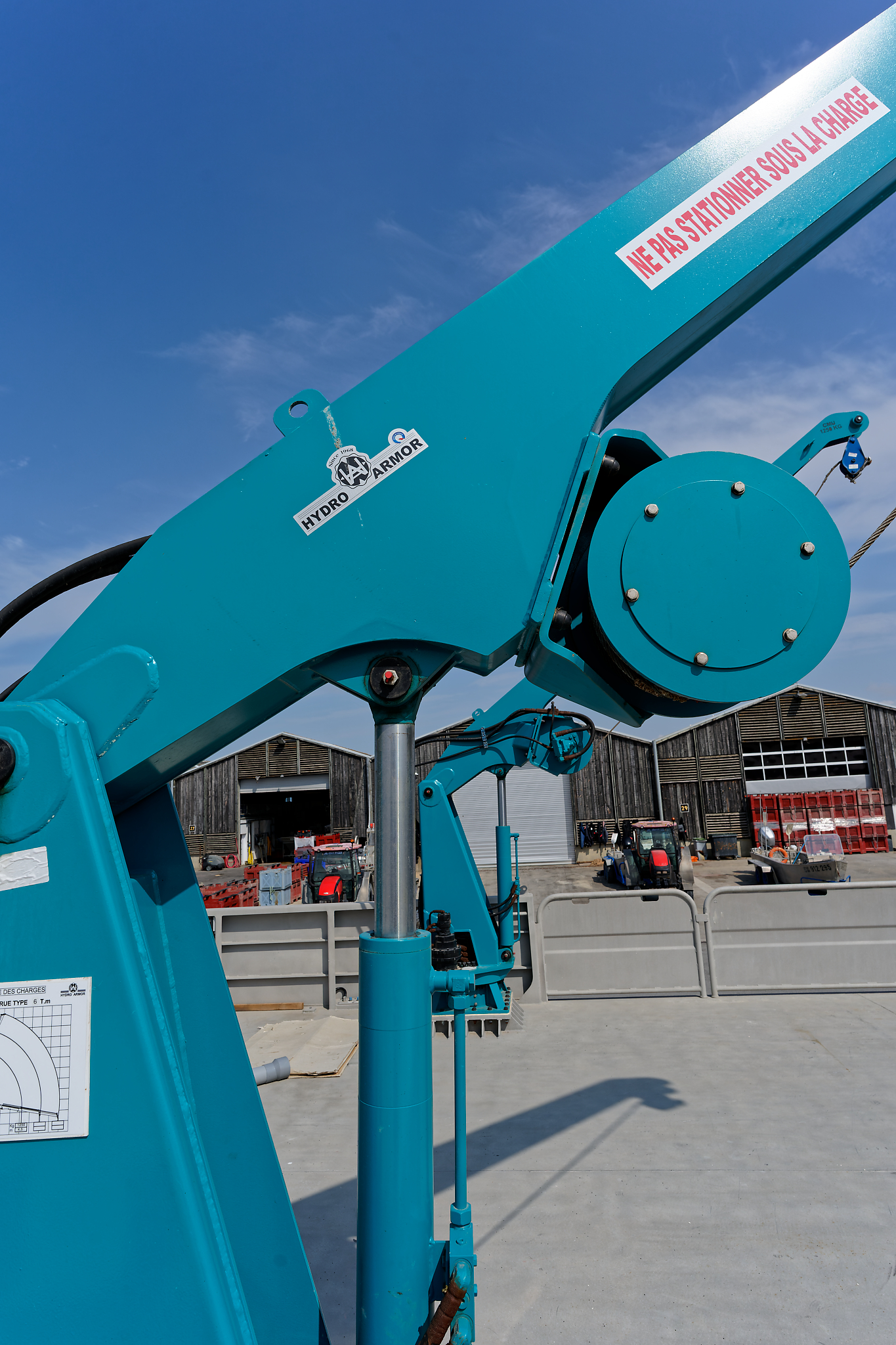 il est équipé d’une grue hydraulique 7 T/M 2T, deux potences hydrauliques 7 T/M et d’un propulseur d’étrave hydraulique.