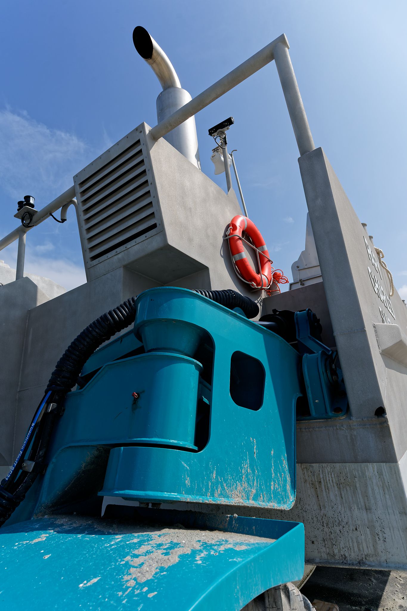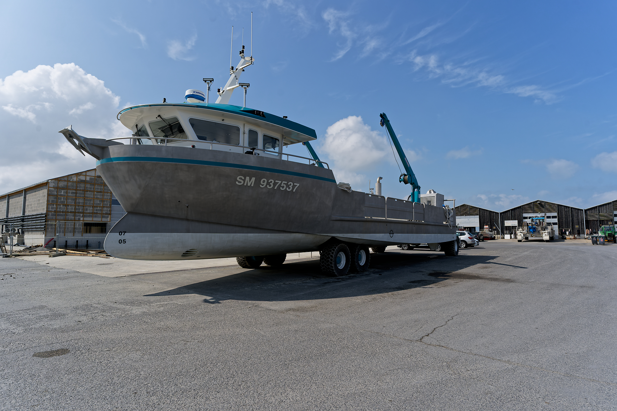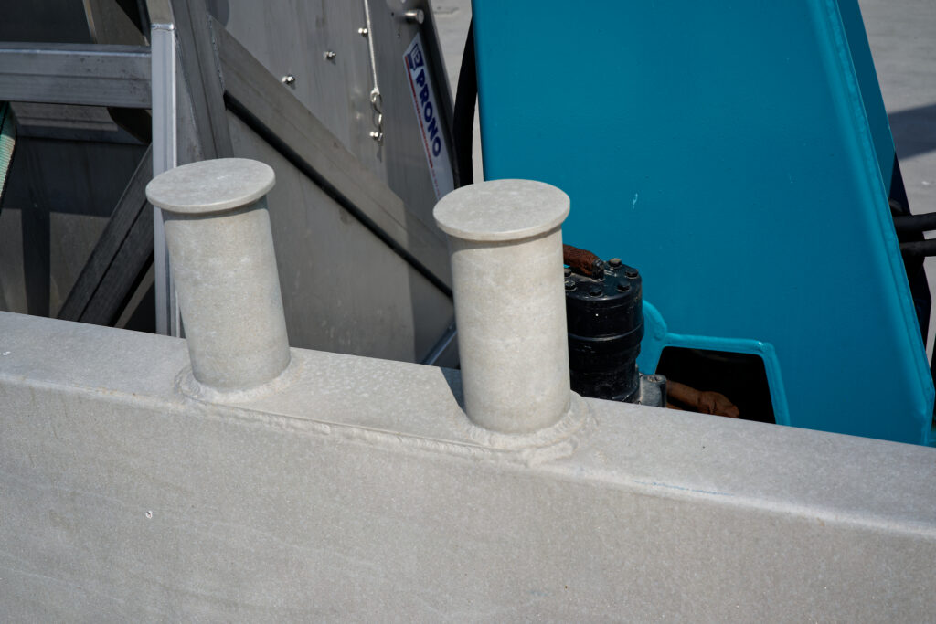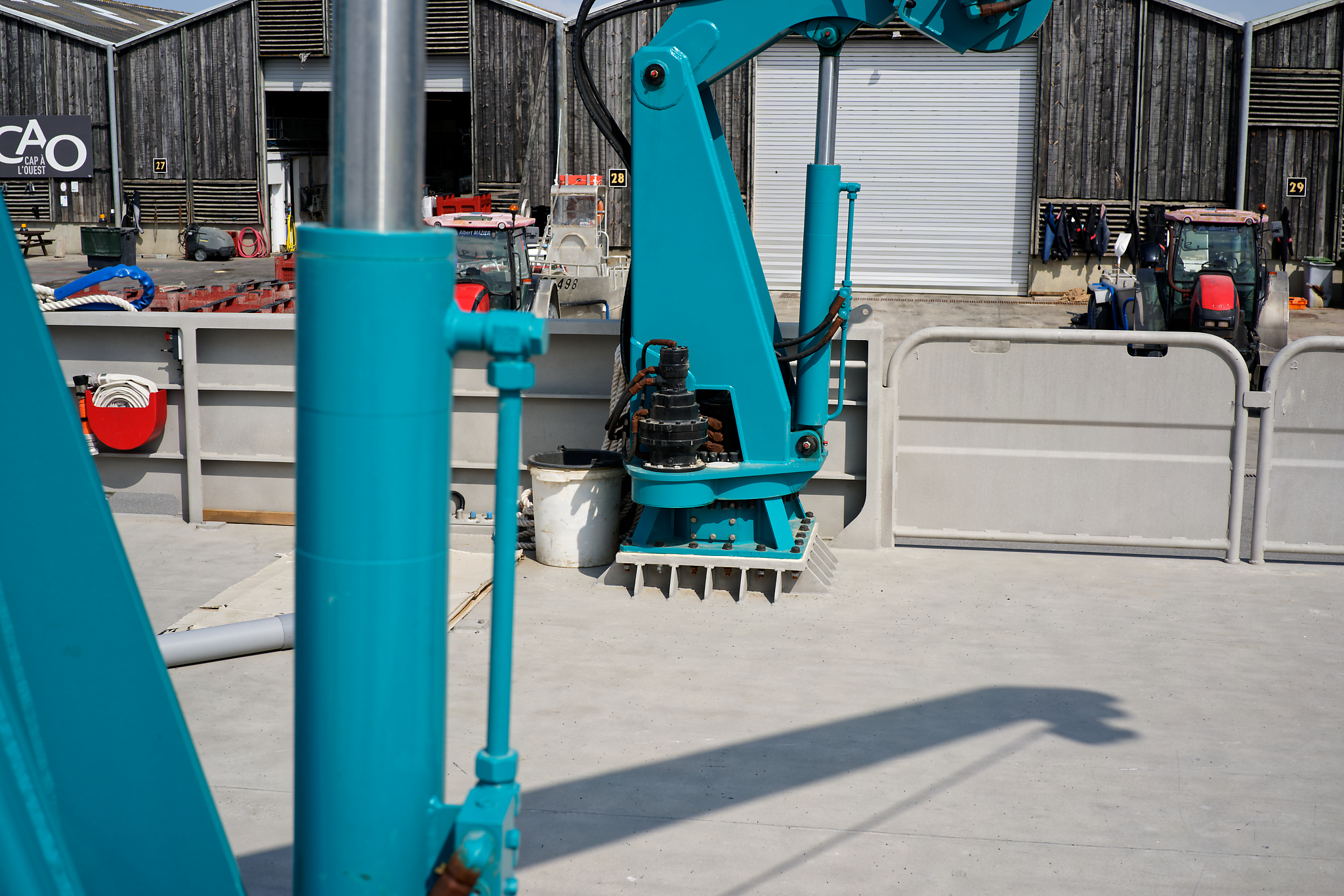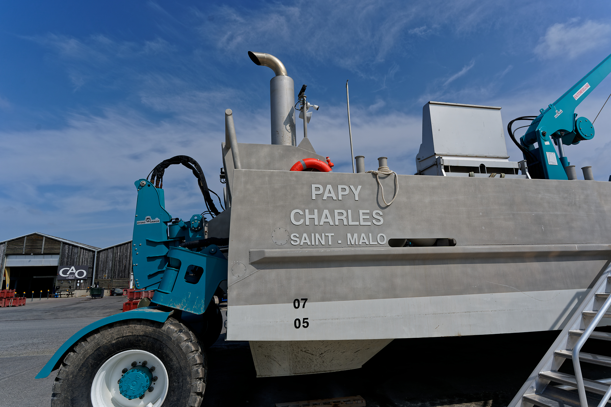 il est équipé d’une grue hydraulique 7 T/M 2T, deux potences hydrauliques 7 T/M et d’un propulseur d’étrave hydraulique.