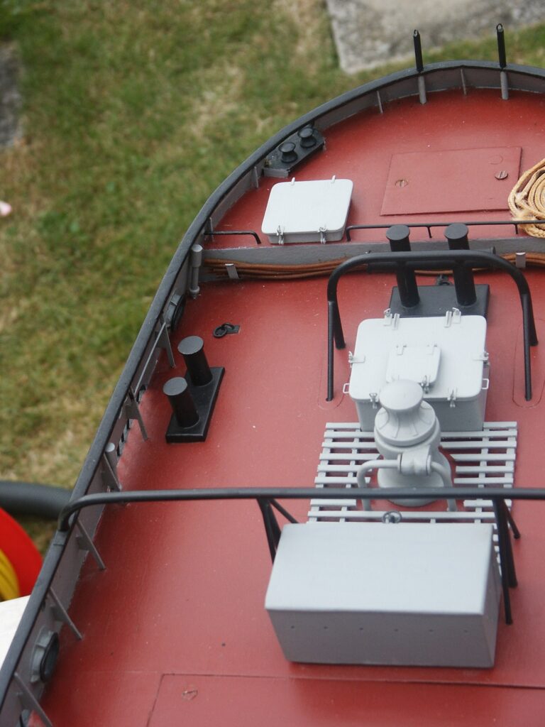 L’éclairage se fait par des diodes de 5 mm, la lance à incendie est fonctionnelle et alimentée par une pompe de lave glace automobile. La maquette est propulsée par  un moteur Décaperm et  ainsi  est capable de tracter une barque en bois avec 3 passagers. Crochet de remorque largable.