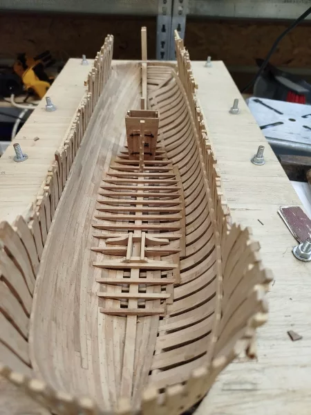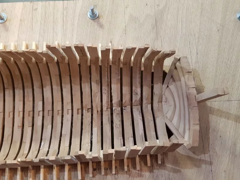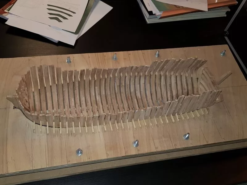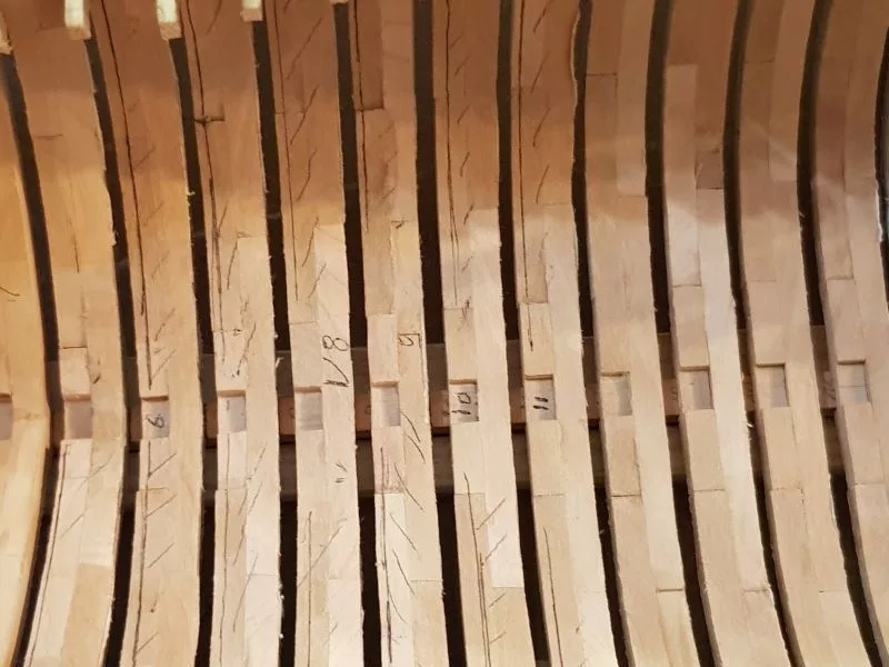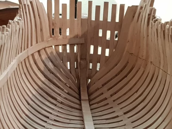 Les couples sont mis en place, collés sur la quille dans « le chantier ». Le tout y restera maintenant jusqu’à ce que l’ensemble soit rigidifié par le reste de la construction. Mais avant d’en arriver là, il faut beaucoup de patience et de temps pour poncer l’intérieur afin d’obtenir un fini régulier.