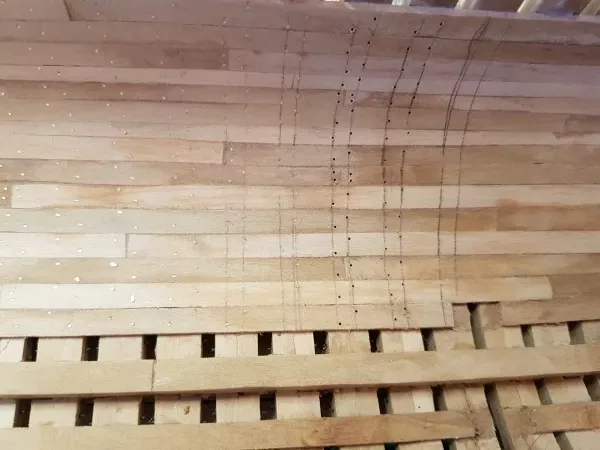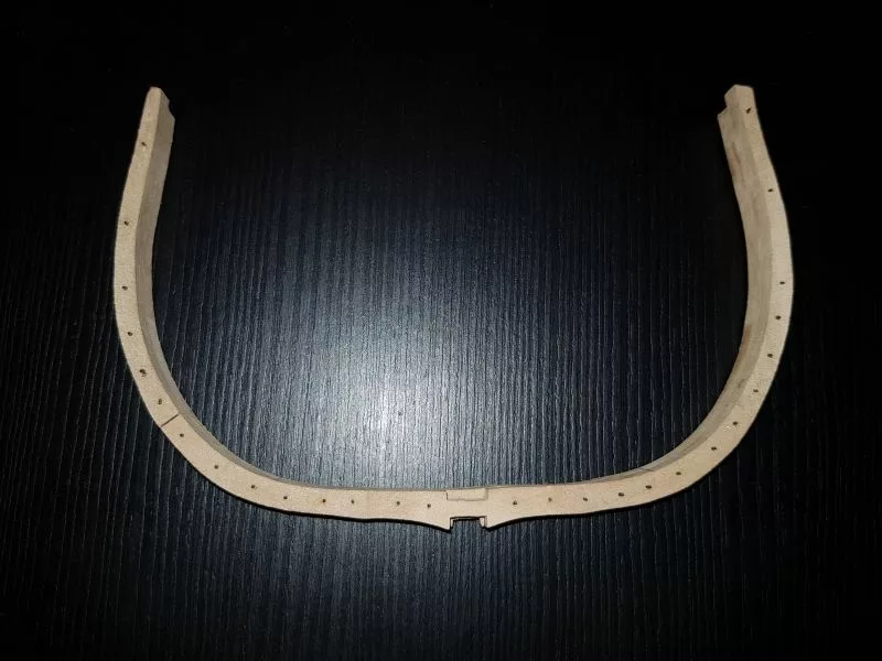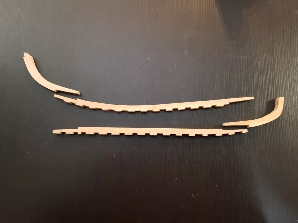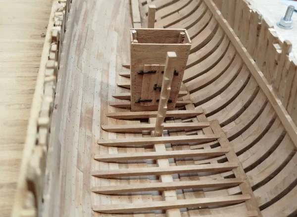 Afin d’assurer une bonne rigidité de la coque, les différentes pièces sont assemblées entre elle par des assemblages à croc (qui eux aussi, ne seront plus visible par la suite).