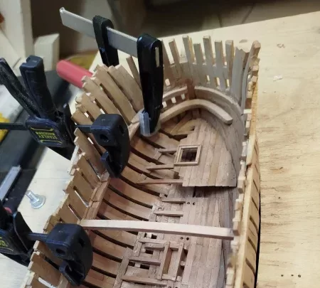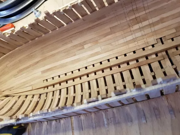 La bauquière, pièce supérieure constituant le vaigrage de la coque et sur laquelle viendront se placer les baux supportant le pont, est constituée de 3 parties.