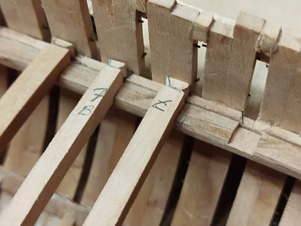 Les couples sont constitués de 2 épaisseurs de pièces (d’où leur nom de couple). Chaque pièce chevauche l’autre sur la moitié de sa longueur et sont chevillées entre elle par 6 chevilles réparties 3 par 3 de chaque côté des jointures. Les chevilles sont réalisées en laiton noirci ici avec un agent noircisseur chimique (tourmaline).