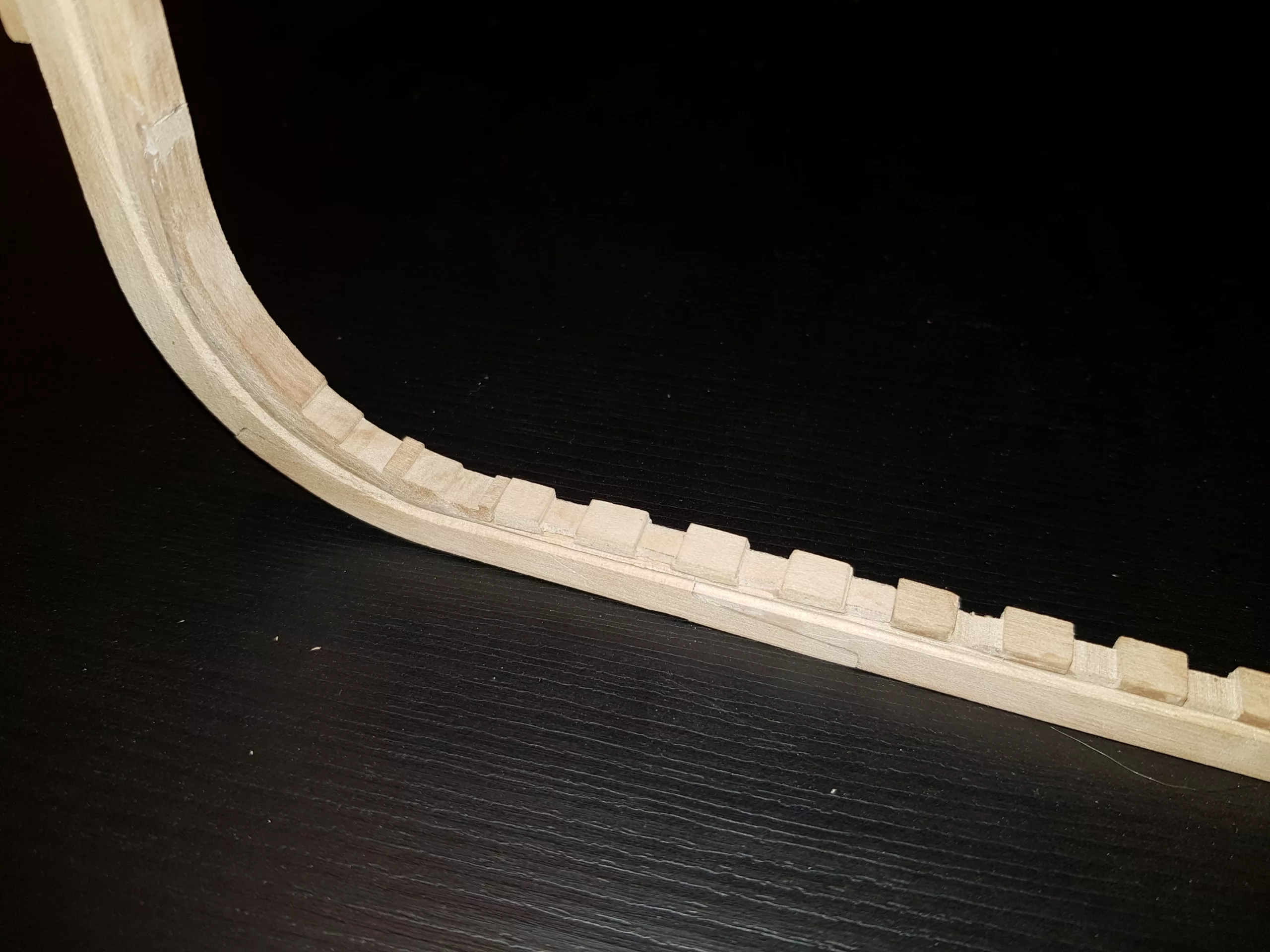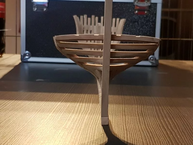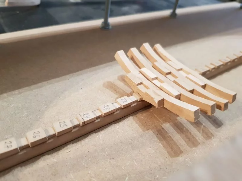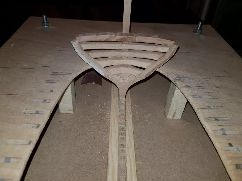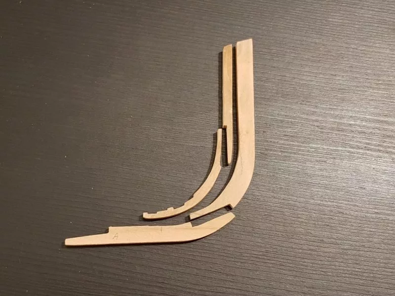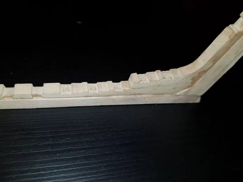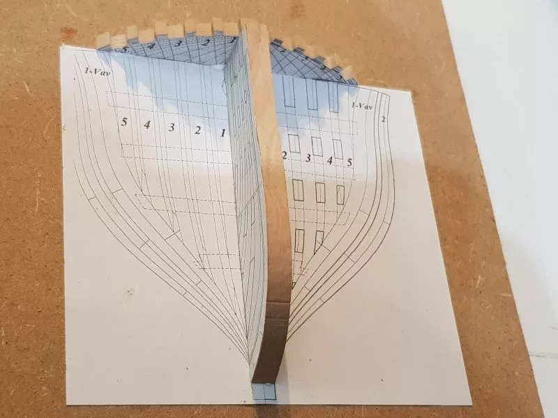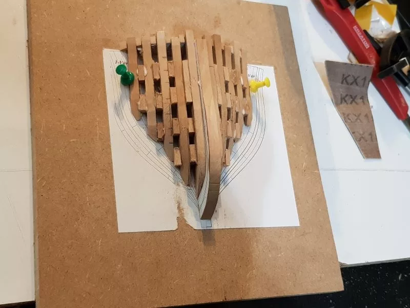 L’étrave, ensemble délicat de pièces qui sera montée sur un montage spécial qui servira de « chantier » les pièces (Les allonges d’écubiers et apôtres sont courbes, ont un profil en sifflet. Ils sont maintenus entre eux et espacés par des clés qui permettent ainsi une ventilation et un séchage du bois. (difficile de le décrire ici en quelques lignes.