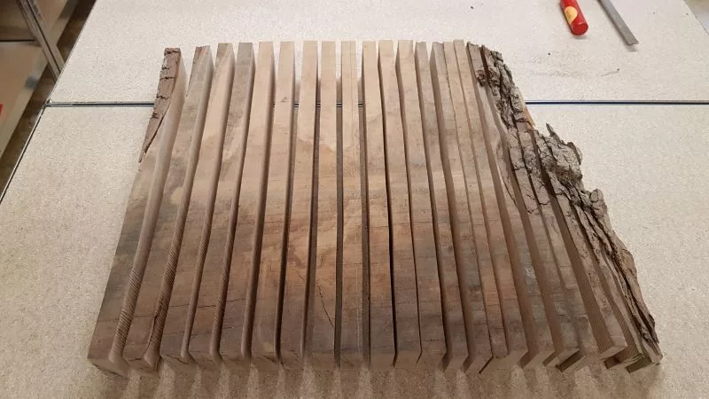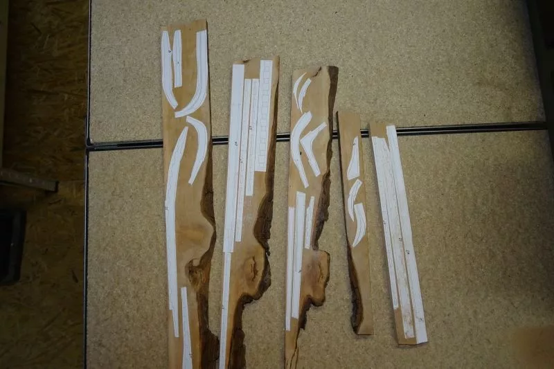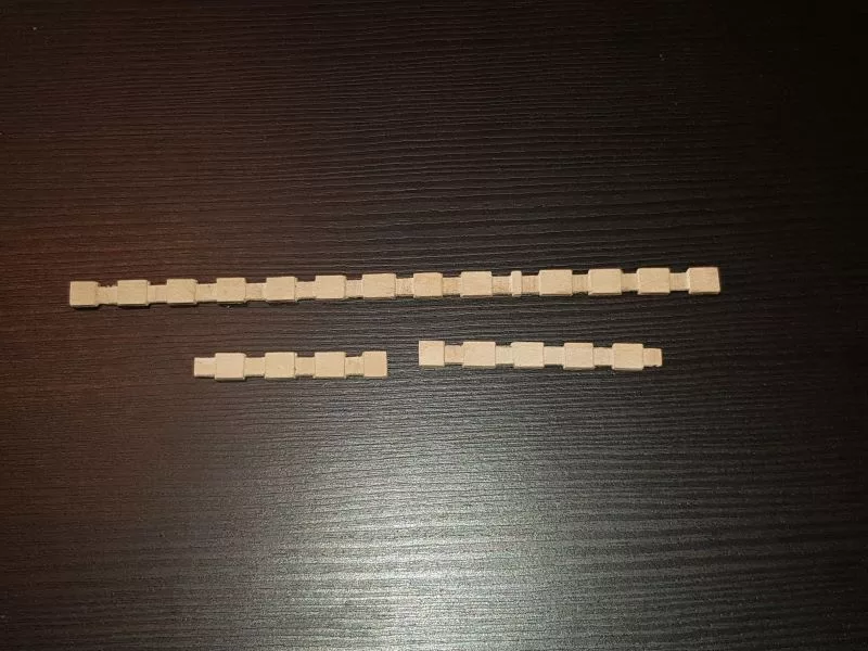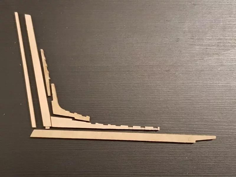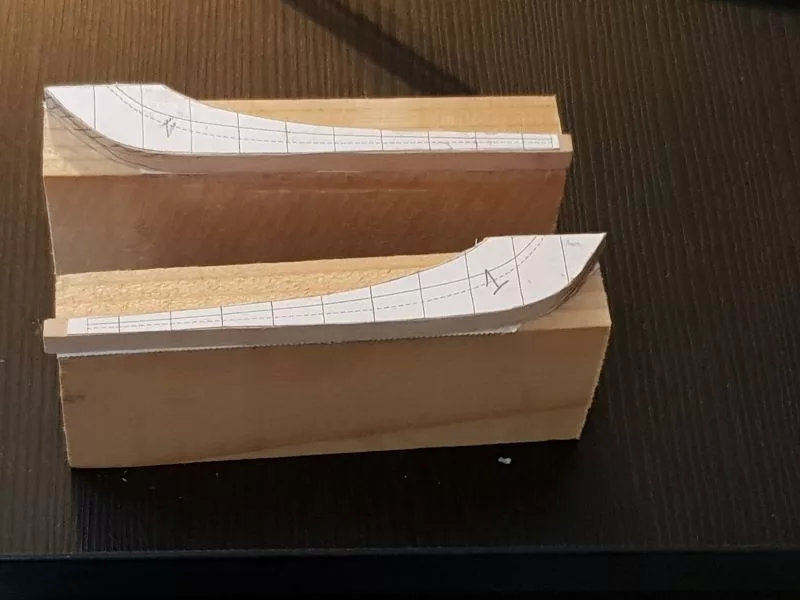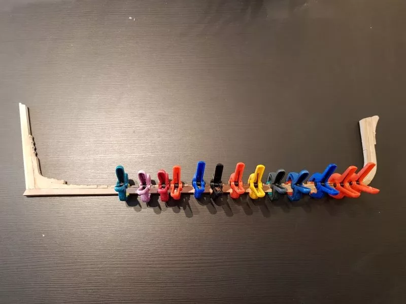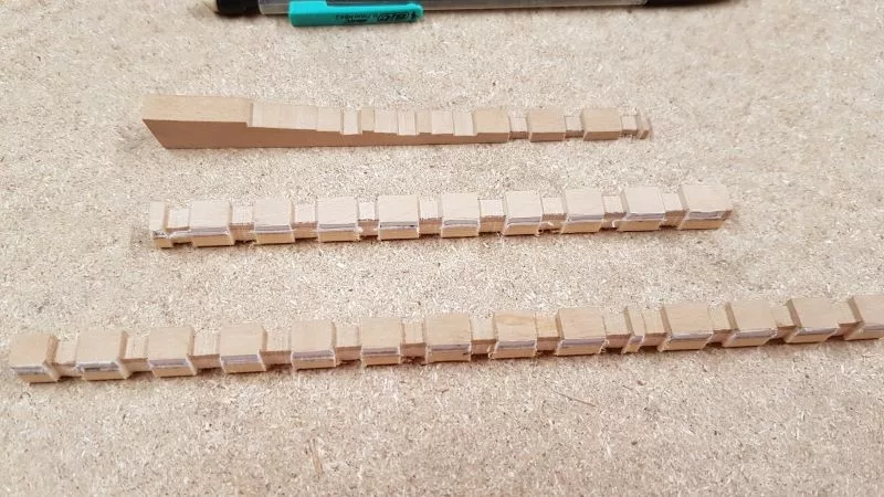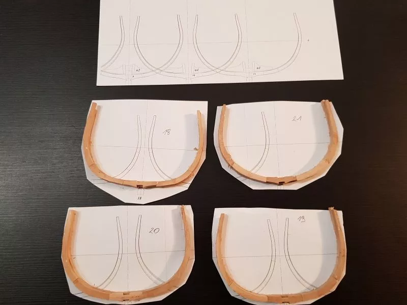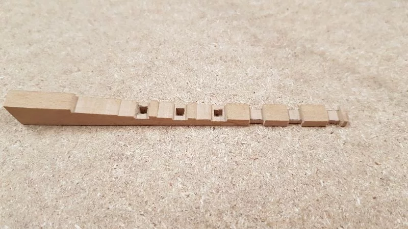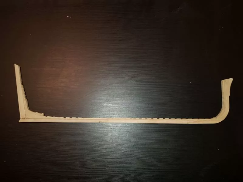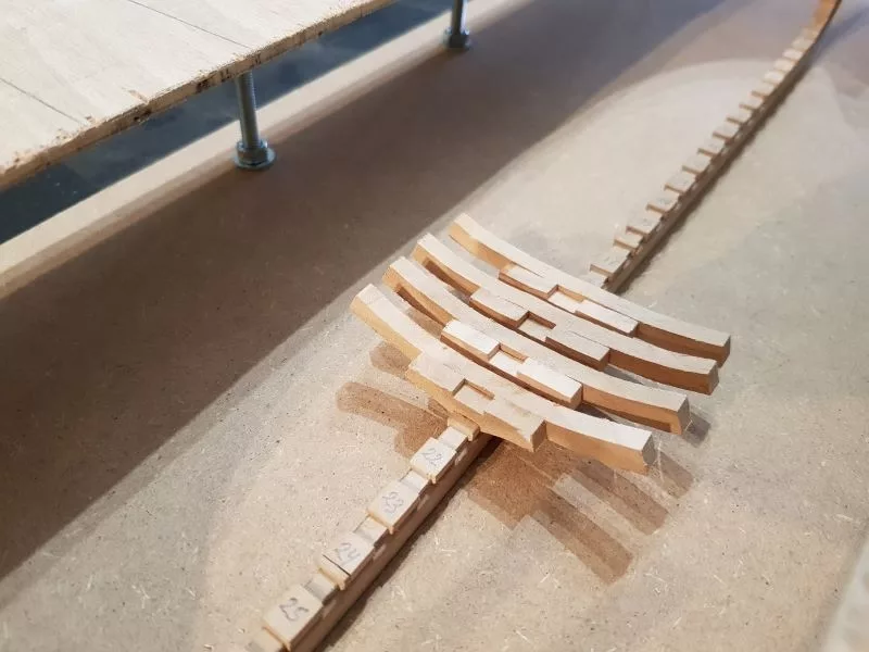 L’étrave, ensemble délicat de pièces qui sera montée sur un montage spécial qui servira de « chantier » les pièces (Les allonges d’écubiers et apôtres sont courbes, ont un profil en sifflet. Ils sont maintenus entre eux et espacés par des clés qui permettent ainsi une ventilation et un séchage du bois. (difficile de le décrire ici en quelques lignes.